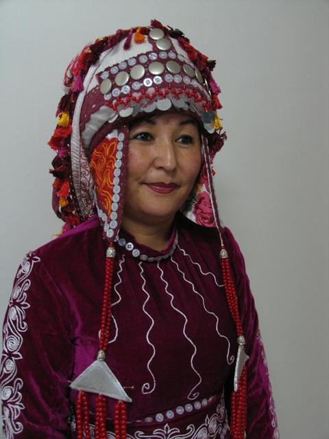 柯尔克孜族妇女喜爱头戴精致丝绸绣花头巾,由前往后将头发整体包起来,两侧的鬓发透过头巾自然下垂,给人一种勤劳、贤惠的整体感觉。