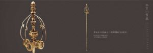 迎真身双轮十二环银锡杖,杖头有银丝盘曲的桃形双轮,轮顶为仰莲束腰座,上托智慧珠一颗。双轮套錾花涂金银锡环12枚,杖顶饰忍冬团花、如意流云、宝相莲瓣的三重佛座,其上承托代表大日如来的五钴金刚杵,杵上又承托代表“地、水、风、火、空”的五大莲座,以象征五世界,座上有摩尼珠一颗。杖体中空,杖身通体錾刻忍冬、蜀葵、团花,装饰上、中、下三段栏界。在上、下栏界内錾刻手执法铃、身披袈裟立于莲台之上的缘觉僧十四体。双轮上錾刻:“文思院准咸通十四年三月二十三日敕令,造迎真身银金花十二环锡杖一枚,并金共重六十两,内金重二两,五十八两银。打造匠臣安淑郧,判官赐紫金鱼袋臣王全护,副使小供奉臣虔诣,使左监门卫将军臣弘慤。”可知,锡杖是唐咸通十四年(873年)懿宗皇帝为迎送佛指舍利敕令工匠专门制作的。这件锡杖全长1.96米,整体造型精美绝伦,古今罕见,工艺更显精巧,堪称佛门奇宝。虽然名为“锡杖”,但它却由58两白银、2两黄金打造,是目前世界等级高、年代早、体型大、制作精美的佛教法器。《西游记》中有如来佛向唐僧赠送“九环锡杖”的情节,而法门寺这件锡杖,属佛祖释迦牟尼,象征佛教至高无上,被誉为“世界锡杖之王”,是我国首批禁止出国(出境)展览的国宝级文物。