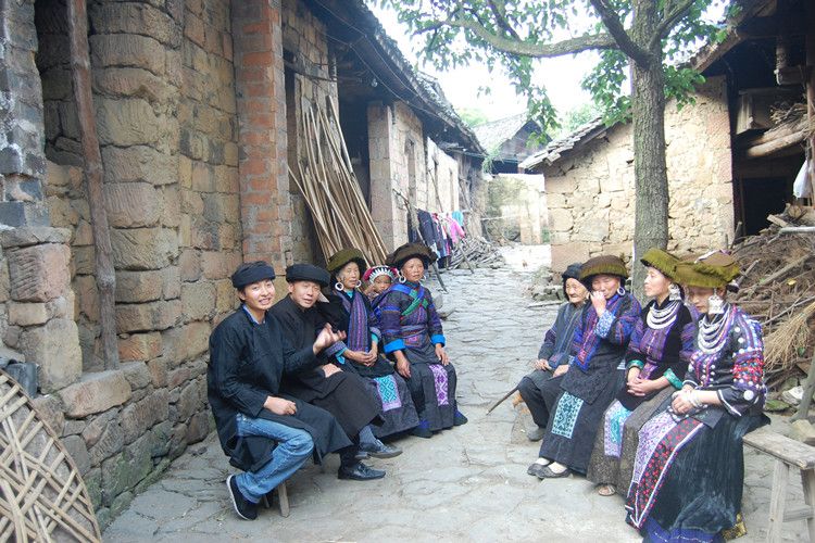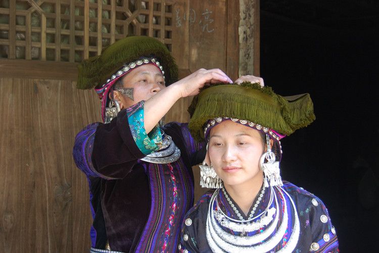 新娘出门时,若寨子有立房子的要停止劳作,遇办丧事的就绕道而行,遇着撞亲,新娘交换手巾。新娘到男家门口时,由“接亲客”领先,男方家请两位福好命好的老年人立于大门两侧斟酒敬茶迎进全部接亲、送亲队伍,新娘则由一位中年妇女指点,先跨左脚进屋,进屋后,坐在中柱位置,表示从今日起当家立志。
