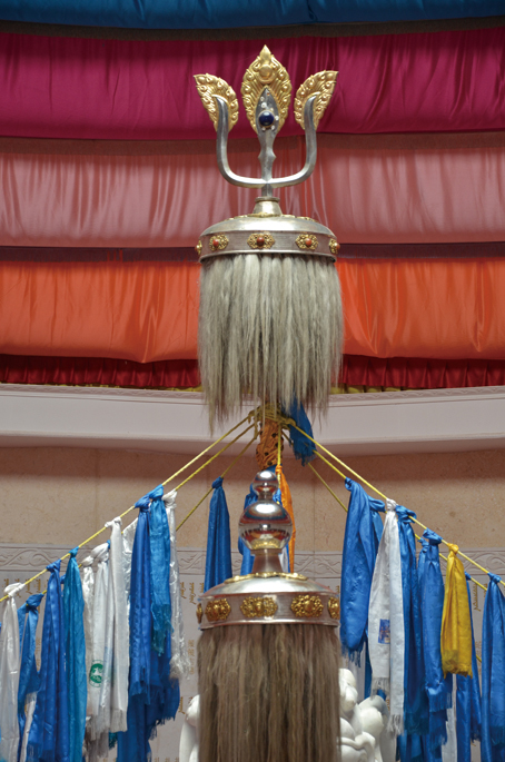 成吉思汗建立的国家称为“伊克·蒙高勒·兀鲁思”,即大蒙古国,俗称“蒙古汗国”。从此,蒙古高原及其相邻地区群雄林立、互相争伐的局面得以结束,近百个大小不一各有名号的诸部都统一在大蒙古国的旌纛之下,按照统一的法律和军事行政机构组合起来(图为大蒙古国察罕苏力德,奥格蒙岱摄于鄂尔多斯乌审旗供奉地)。